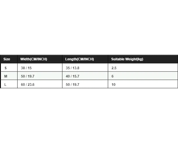 Size,Width,Length,Suitable Weight(kg)